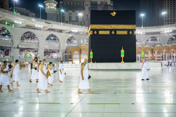 At midnight, tens of registered pilgrims wearing face masks prepared to enter the Grand Mosque in small groups.