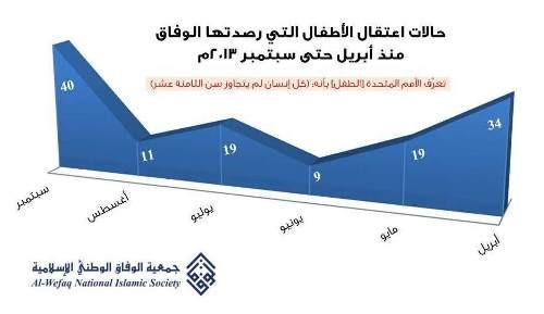 والجدير بالذكر أن اعتقالات الأطفال بلغت ذروتها في سبتمبر المنصرم بـ 40 حالة اعتقال مقارنة بالأشهر الخمسة الماضية: أبريل (34 حالة)، مايو/ أيار (19 حالة)، يونيو/حزيران (9 حالات)، يوليو/ تموز (19)، أغسطس/ آب (11 حالة).