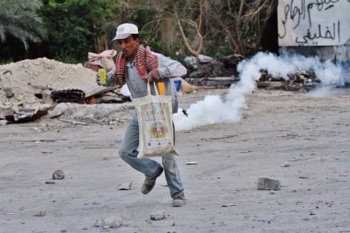 مرآة البحرين: نشر نشطاء صورة مؤثرة لعامل آسيوي كان يحاول الفرار من عبوة غاز مسيل للدموع ألقتها الشرطة أثناء قيامها بتفريق محتجين في منطقة قريبة من المنامة.