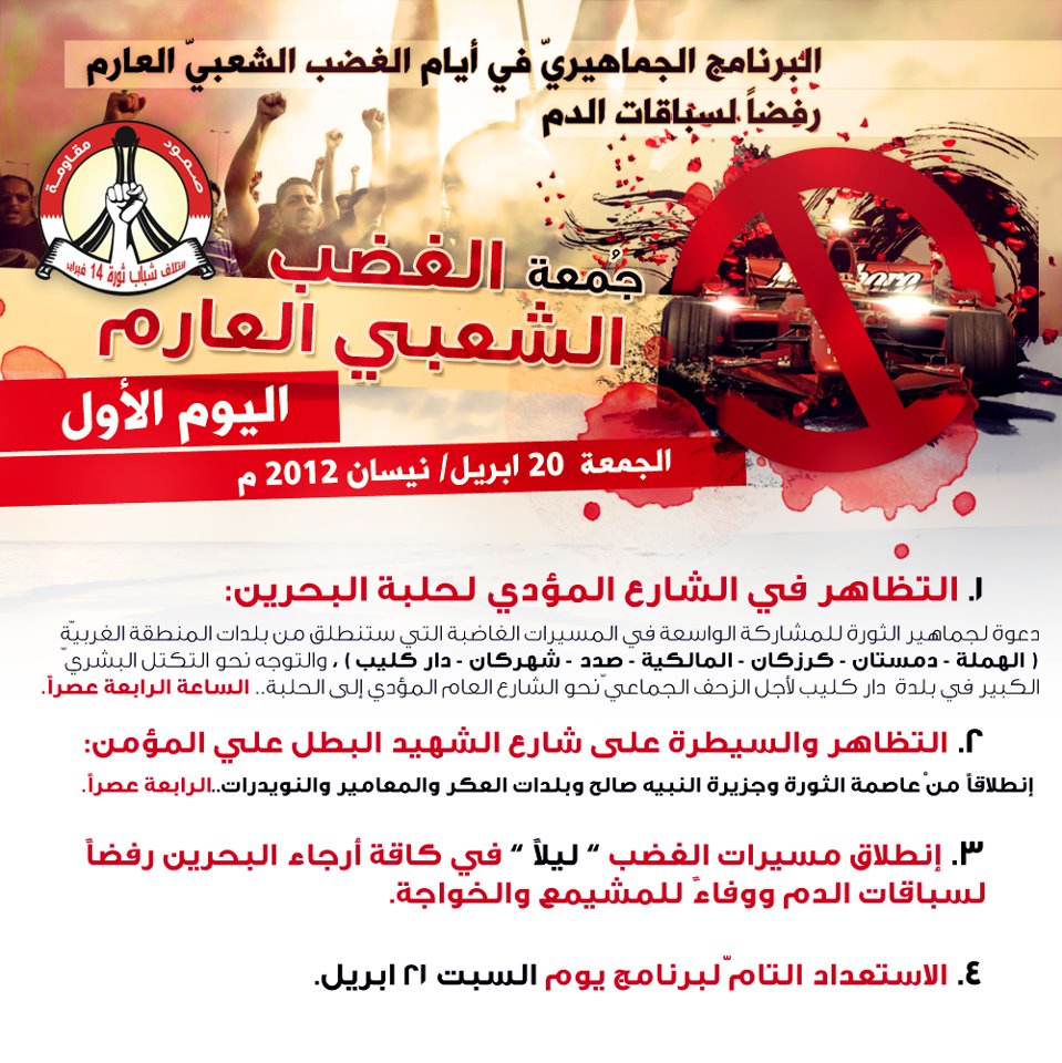 مرآة البحرين: دعا "ائتلاف شباب ثورة 14 فبراير" الجماهير البحرينية إلى الزحف نحو الشارع المؤدي إلى حلبة البحرين الدولية الرابعة عصر غد الجمعة رفضاً لإقامة سباق "فورمولا واحد".