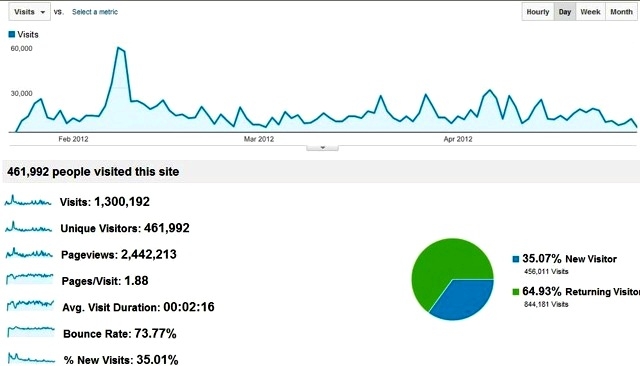 وكان شهر فبراير/شباط 2012 أعلى شهر من حيث عدد الزيارات، حيث حصد الموقع فيه أكثر من 480 ألف زيارة. ولم تقل الزيارات خلال هذه الفترة عن 4000 زيارة في اليوم الواحد في حين بلغت في بعض الأيام أكثر من 50 ألف زيارة في اليوم الواحد.