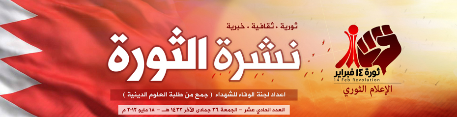 مرآة البحرين: صدر عدد جديد من "نشرة الثورة"، وهي عبارة عن نشرة إسبوعية يقوم بتحريرها عدد من طلبة العلوم الدينية. وضم العدد الذي حمل رقم (11) موضوعات تركز على الطابع التأصيلي لثورة 14 فبراير/ شباط، بالبناء على مقولات القيادات السياسية والدينية، إضافة إلى جرد وافي ليوميات الثورة عبر "الحصاد الأسبوعي" الذي تواظب على عمله منذ إطلاقها.