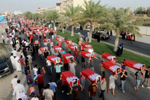 وقال المرزوق، خلال تأبين الشهيدين العسكريين جواد الشملان وعبدالعزيز عياد مساء الجمعة في منطقة الحجر غرب العاصمة المنامة، قال إن "ما جرى في جنيف قبل أيام ما هو إلا شعار من شعارات النصر، كيف يكون الخزي لهذه الحكومة الظالمة وكل من يساندها وكيف يكون للشعب العزة والنصر والإباء".