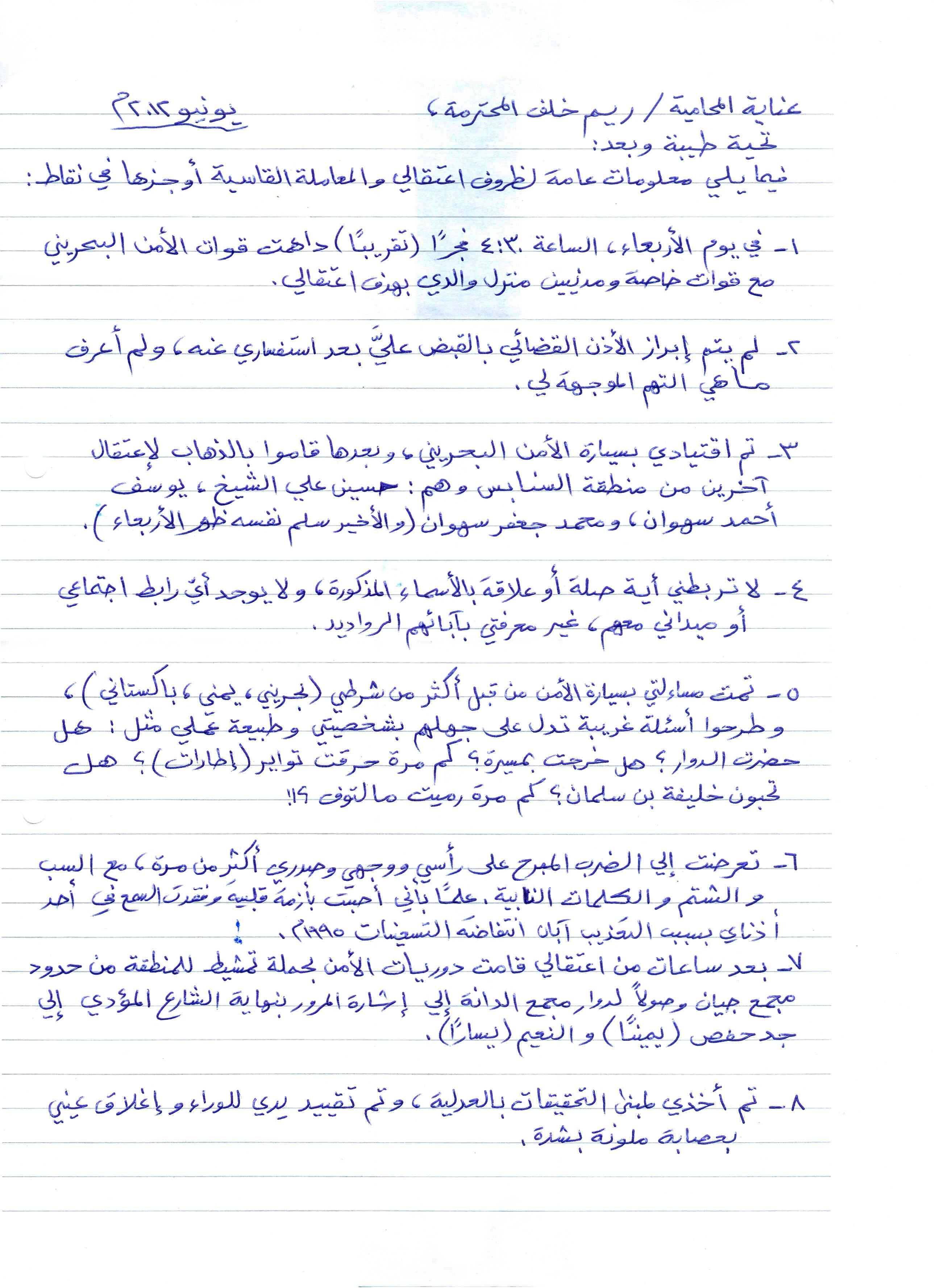 وقال رضي إن "قوات الأمن دهمت منزل والدي فجرا ترافقها قوات خاصة ومدنيين بهدف اعتقالي"، مشيرا إلى أنه "لم يتم إبراز الإذن القضائي بالقبض علي بعد استفساري عنه". وأكد أنه نقل بسيارة الأمن البحريني "وبعدها ذهبوا إلى اعتقال آخرين من منطقة السنابس هم: حسين علي الشيخ، يوسف أحمد سهوان، محمد جعفر سهوان"، مضيفا "تمت مساءلتي في السيارة عما إذا حضرت إلى الدوار او خرجت إلى مسيرة وما إذا كنت أحرقت إطارات".