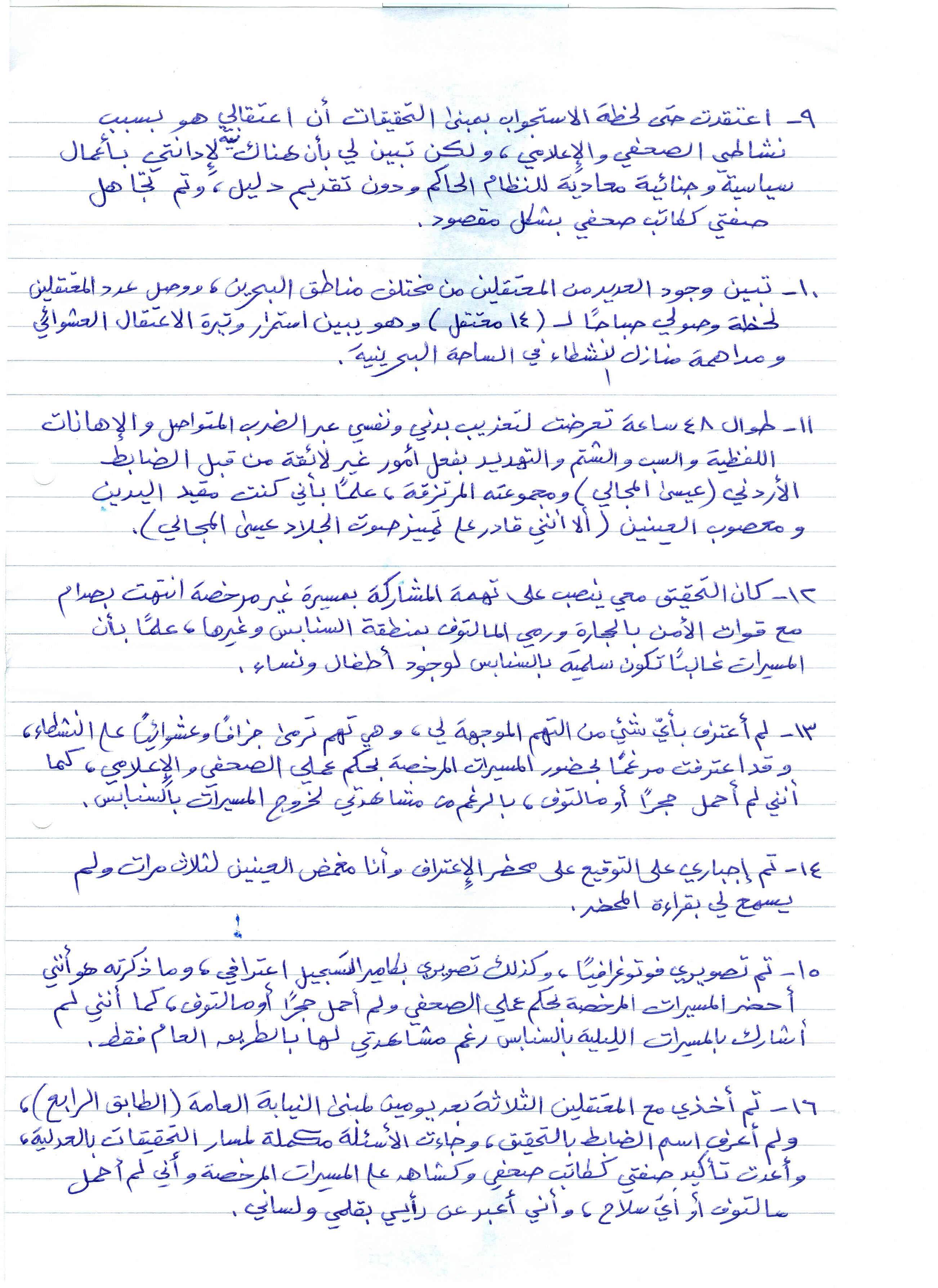 وذكر أن التحقيق تركز معه على تهمة المشاركة في مسيرة غير مرخصة انتهت بصدام مع قوات الأمن"، فـ"لم أعترف بأي شيء من التهم الموجهة إلي واعترفت مرغماً بحضور المسيرات المرخصة بحكم عملي كما أني لم أحمل حجراً أو مولوتوف"، مضيفا "أجبرت على التوقيع على محضر الإعتراف وأنا مغمض العينين لثلاث مرات ولم يسمح لي بقراءة المحضر".