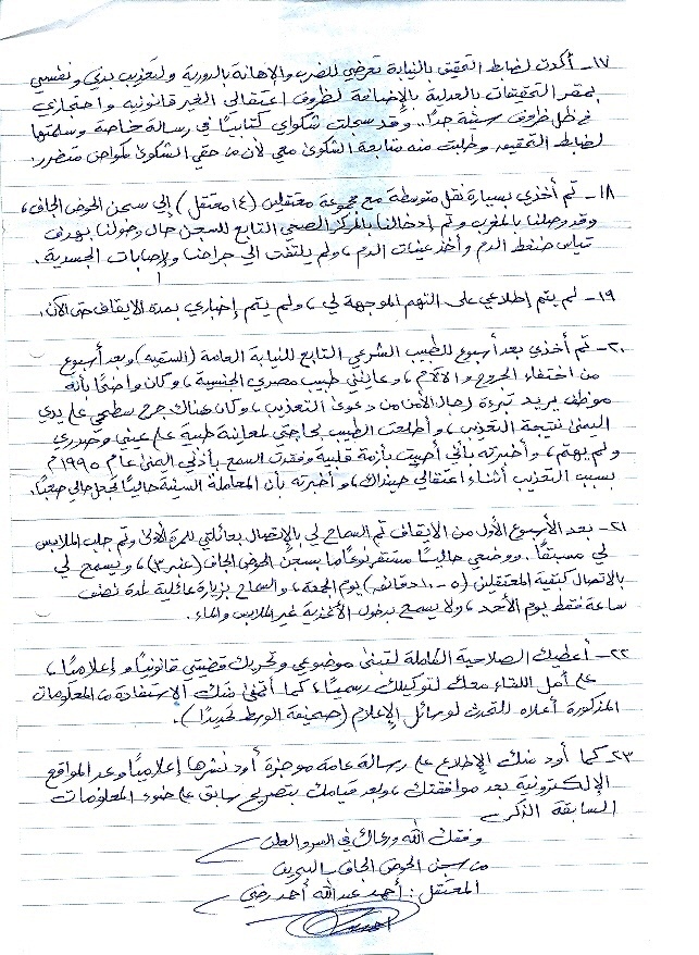 وذكر أنه نقل مع 14 معتقلا إلى سجن "الحوض الجاف" وأدخلنا إلى المركز الصحي التابع للسجن حال وصولنا وأجريت لنا فحوصات ولم يلتفت أحد إلى جراحنا والإصابات الجسدية". وأضاف "تم أخذي بعد اسبوع إلى طبيب شرعي مصرب الجسنية تابع للنيابة عقب اختفاء الجروح والآلام، وكان واضحا أنه موظف يريد تبرأة رجال الأمن من دعوى التعذيب"، قائلاً: "كان هناك جرح سطحي على يدي اليمنى نتيجة التعذيب وأطلعت الطبيب عليه وعلى حاجتي إلى معاينة طبية لكنه لم يهتم".