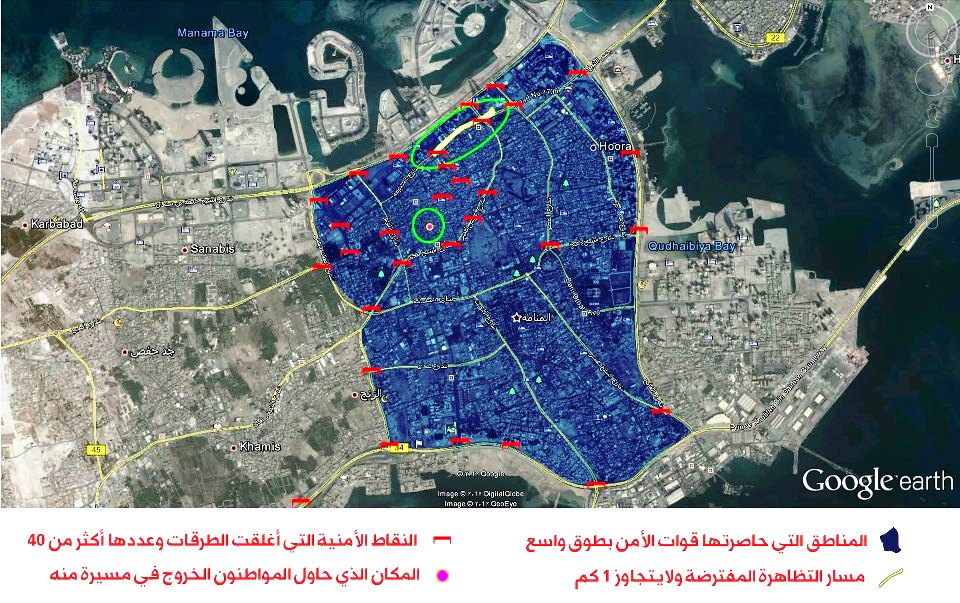 وأشار إلى وجود أكثر من 40 نقطة أمنية بسيارات ومدرعات الأمن حاصرت العاصمة وعطلت 3 من أهم شوارع البحرين، هم شارع الفاتح وشارع الملك فيصل والهايوي المؤدي للسعودية"، مؤكدا أن "ما طلبته المعارضة هو كيلو متر واحد فقط من البريد القديم إلى المحكمة، وهذا الشارع يطل فقط على المكاتب التجارية وهي مغلقة يوم الجمعة".