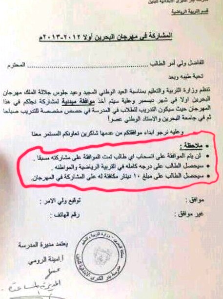 مرآة البحرين: بينت وثيقة قيام وزارة التربية والتعليم في البحرين برشوة طلاب وطالبات المدارس البحرينية، عبر إغرائهم بالحصول على مبلغ 10 دينار، والعلامات الكاملة في مواد التربية الرياضية والوطنية، إذا وافقوا على المشاركة في مهرجان تنظمه بمناسبة ذكرى جلوس الملك.
