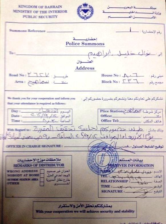 وأوضحت أنه "في اليوم التالي استلمت إحضارية للحضور الفوري غلى مركز شرطة سماهيج، وحين ذهبت أدخلت على الشرطة النسائية وقد أتهمتني المحققة مع زوجي بالاعتداء علي رجال الامن وجرحهم"، مؤكدن أنهم قاتلوا إن القوات "حضرت ودقت الجرس وانتظرتنا خارجا حتى قدمت وزوجي إليهم وبدأنا بسبهم والاعتداء عليهم"، فـ"أنكرت ذلك واخبرتها بطريقة دخولهم واني دافعت عن نفسي ووقعت إفادة بأقوالي وتعهد للحضور بأي وقت يطلبون مني ذلك".
