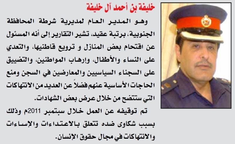 وقال التقرير الذي دشنه "منتدى البحرين لحقوق الإنسان" في مؤتمر صحفي ببيروت اليوم إن كلاً من نجلي الملك ناصر بن حمد آل خليفة وخالد بن حمد آل خليفة، إضافة إلى الملازم نورة بنت إبراهيم آل خليفة، والمدير العام لمديرية شرطة المحافظة الجنوبية خليفة بن أحمد آل خليفة، قد زاولوا التعذيب في مراكز الاعتقال والتوقيف أو في نقاط التفتيش والمفرز المدنية، إزاء النشطاء المدنيين.