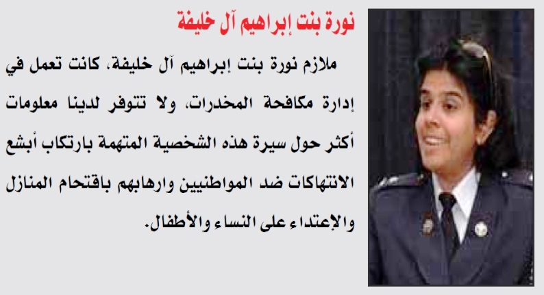 كما روى التقرير الأيام الصعبة التي مرت بها الشاعرة آيات القرمزي وهي بين يدي نورة آل خليفة نفسها "فوجئت بامرأة قد سحبت جسدي نحوها وأخذت تصفعني بشدة على وجهي وهي تصرخ «آل خليفة تاج رأسكم يالشيعه، وهؤلاء أسيادك يالقحبة يا بنت المتعة» وهي تصرخ وتشتمني وتصفعني على وجهي بشدة إلى أن نزل اللثام عن عيني قليلاً ولمحت وجهها، وسارعوا في رفعه وتغطية عيني، وهي على هذا الحال فاجأتني بصعق كهربائي على وجهي".