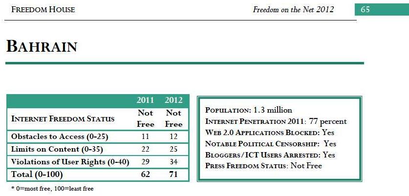 وانخفض تصنيف البحرين 9 نقاط ليصل إلى 71 بعد أن كان 62 في 2011 (درجة 100 هي الأسوأ، ودرجة 0 هي الأفضل)، واستمرت البحرين مصنفة في مجموعة الدول "غير الحرة" في استخدام الإنترنت، كما اشتركت مع السعودي في مرتبة ثالث أسوأ دولة على مستوى الإقليم، وذلك بعد سوريا وإيران.