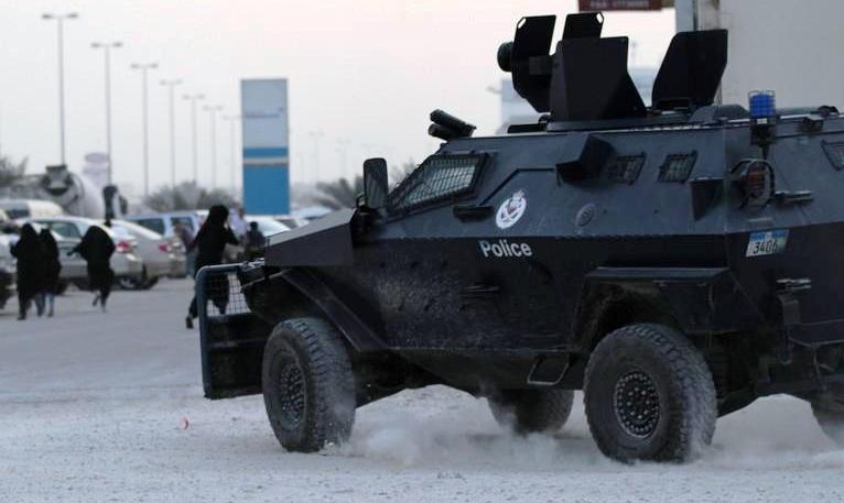 مدرعة تابعة للأمن البحريني وهي تلاحق مجموعة من النساء في قرية العكر المحاصرة