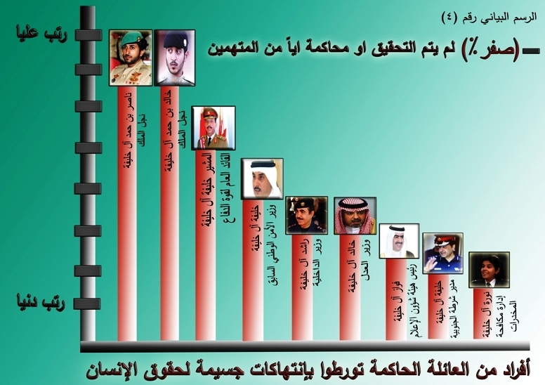 كما تبين للمركز بأنه لم يتم التحقيق أو محاكمة او إدانة أيّا من المسئولين من أصحاب الرتب العليا، وأن من تم التحقيق معهم كلهم من أصحاب الرتب الدنيا (شرطة)، فلم يتم التحقيق أو التحويل للقضاء لأي من مسئولي قوة دفاع البحرين أو الحرس الوطني أو جهاز الأمن الوطني أو وزارة الداخلية أو الحرس الوطني. وأوضحت الدراسة بأنه من النتائج أيضا عدم محاسبة أيا من أفراد العائلة الحاكمة الذين تورطوا في الانتهاكات بشكل مباشر أو غير مباشر بما فيهم نجلي الملك الأمير ناصر وخالد بن حمد.