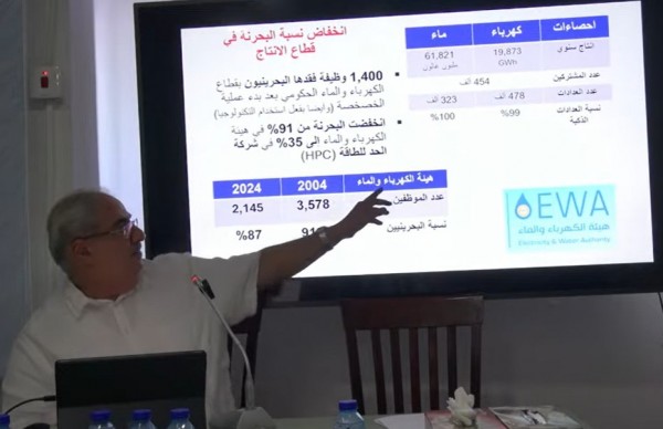 وأضاف أن نسبة البحرنة في قطاع الكهرباء والماء انخفضت من 91% إلى نحو 35%، وخسر البحرينيون نحو 1400 وظيفة منذ بدء الخصخصة، متسائلًا عن جدوى خصخصة قطاع تدّعي الحكومة أنها خفّضت كلف إنتاج الوحدة فيه من 18 فلسًا إلى 11 فلسًا.