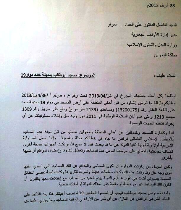 عريضة من أهالي مدينة حمد للأوقاف الجعفرية ترفض التنازل عن موقع مسجد أبو طالب