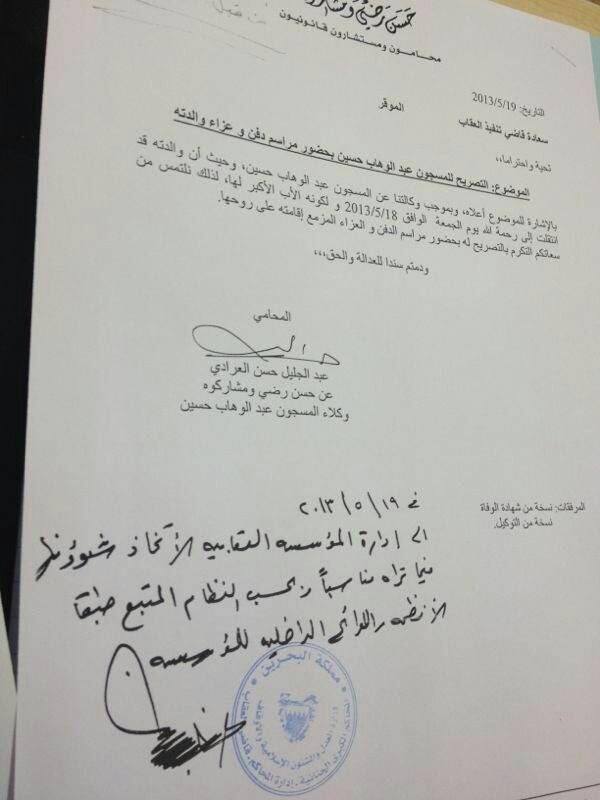 وأشار علي حسين إلى أن إدارة سجن "جو" رفضت بداية استلام رسالة ـ أمر صادر من قاضي تنفيذ العقاب لشقيقه بحضور تشييع والدته التي توفيت يوم الجمعة الماضي، ثم تسلمتها بعد الإصرار منه، مشيرا إلى أن القاضي "تسلم رسالة من محامي شقيقي وعلق عليها بتخويل إدارة السجن اتخاذ الإجراءت اللازمة حسب الأنظمة المتبعة واللوائح الداخلية للسجن، وتم التأكد من وصولها إلى مكتب مدير الإدارة".