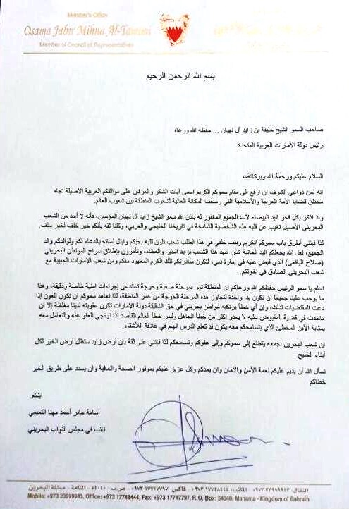 وقال التميمي، في رسالته، "إن أي خطأ يرتكبه مواطن بحريني في حق دولة الإمارات تكون عقبته لدينا مغلظة، إلا أن ما حدث في قضية المقبوض عليه لا يعدو أكثر من خطأ الجاهل وليس العالم القاصد، لذا نرتجي العفو عنه والتعامل معه بمثابة الابن المخطىء".