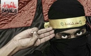 جين مارلو : امرأة أسميتها م تخطو بسرعة على الطريق الرئيسي لقريتها وهي ترتدي البرقع وقد لفت كتفيها بالعلم البحريني، الذي راح يرفرف بقوة عندما يهب النسيم، بلونيه الأحمر والأبيض.