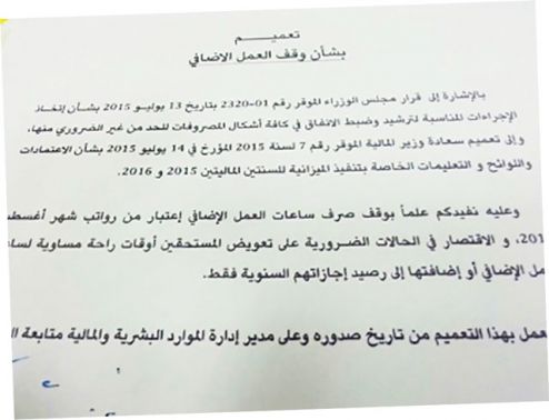 According to the notice, the decision was issued within the framework of "government decree 01-2320 issued on July 13, 2015 with regards to taking the adequate measures to direct and control spending in all types of expenditures to put an end to what is unnecessary and the Ministry of Finance's notice No. 7/2015, dated July 14, 2015 regarding the appropriations, lists and special recommendations for implementing the budget for the two fiscal years 2015 and 2016."