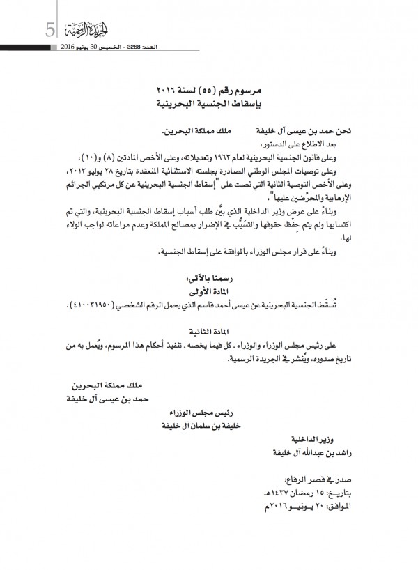 The first article of Royal Decree 55/2016 published in the official gazette issue of Thursday (June 30, 2016) stipulates that "the Bahraini citizenship of Isa Ahmad Qassim who holds personal number (410031950) has been revoked."