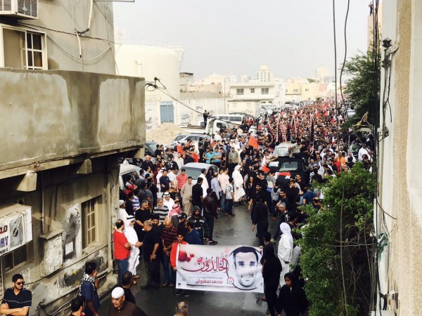 Bahrain Mirror: Thousands of angry mourners in Sanabis took part Friday (March 17, 2017) in the funeral procession of martyr Mohammad Sahwan (45 years old), who died in prison last Thursday.