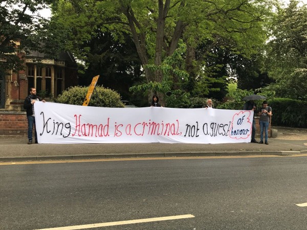 Activists held a banner with the words "King Hamad is a criminal, not a guest of honor" written on it.