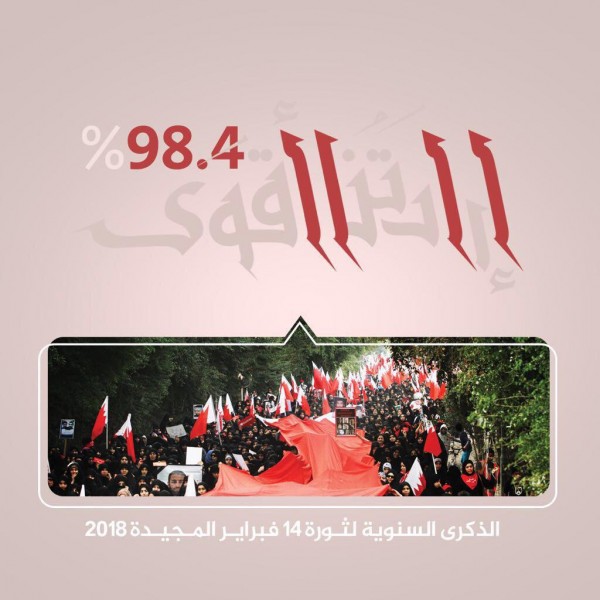 Bahrain Mirror: In a statement marking the seventh anniversary of the February 14, 2011 movement at the Pearl Roundabout, Bahrain's main opposition group, Al-Wefaq Society, said they managed as Bahrainis to "achieve 98.4% with our strong will, and we still have the same energy to carry on," referring to the anniversary of the vote on the National Action Charter on February 14, 2001, which ended the political crisis following the 1990s uprising.