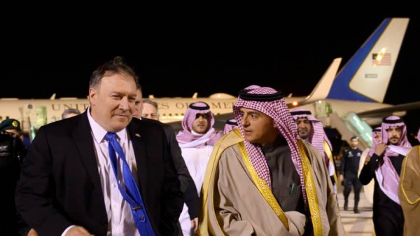 Arriving in Riyadh, Pompeo was greeted at the airport by Adel al-Jubeir, the Saudi minister of state for foreign affairs, Prince Khalid bin Salman, the Saudi ambassador to Washington, and U.S. Charge D'Affaires Christopher Henzel.