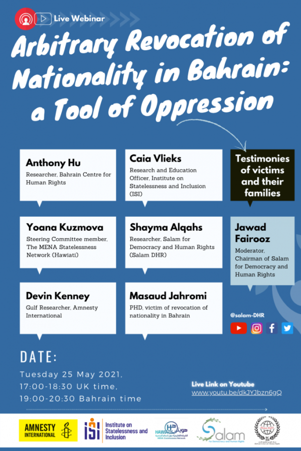 Salam for democracy and Human Rights launched, in cooperation with, the Institute on Statelessness and Inclusion and the MENA Statelessness Network, on Tuesday (May 25, 2021), a report entitled "Arbitrary Revocation of Nationality in Bahrain: A Tool of Oppression".
