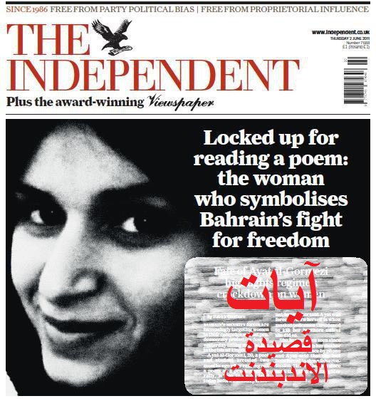 آيات القرمزي، 20 سنة شاعرة وطالبة في كلية المعلمين في البحرين، تم اعتقالها في 30 مارس بسبب إلقائها قصيدة تنتقد فيها الحكومة، أثناء الاحتجاجات المطالبة بالديمقراطية في دوار اللؤلؤة، وهو المكان الرئيسي للاحتجاجات في فبراير. كانت مرغمة على تسليم نفسها حين داهمت الشرطة بيت والديها وأجبروا أخوانها على الانبطاح أرضاً تحت تهديد السلاح. لم تكن آيات بالمنزل في ذلك الوقت. صرخ الشرطي على والدها "أخبرنا أين آيات وإلا سنقتل أحد أبنائك أمام عينيك".