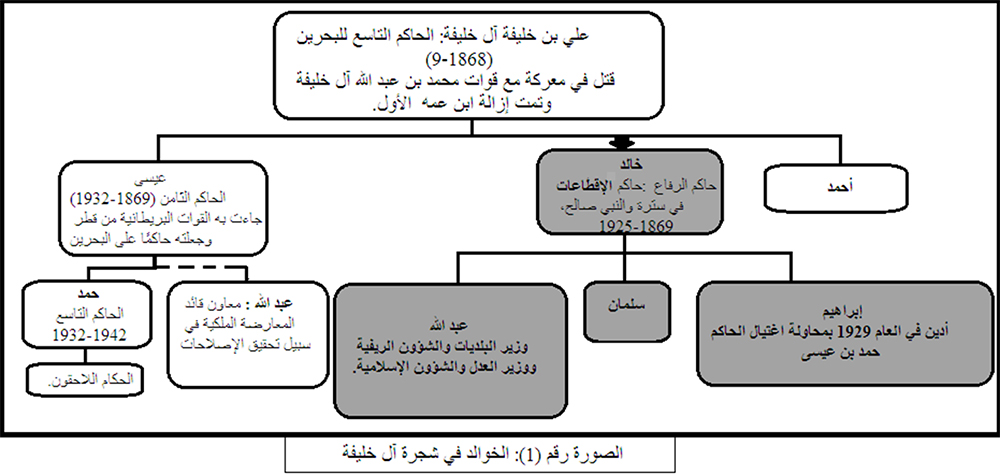 بقي أبناء وأحفاد الشيخ خالد خلال القرن العشرين خارج مركز السلطة في البحرين، ليس فقط بسبب نفيهم في العام 1924 بل نتيجة لأسباب أخرى منها: وصول تشارلز بلغريف بعد عامين، وهو المقيم البريطاني الذي بقي مستشارًا للشيخ حمد ونجله وللحاكم الجديد الشيخ سلمان لمدة تتجاوز ثلاثة عقود. بلغريف المعروف بالمستشار، أشرف على تنفيذ الإصلاحات الإدارية، وبشكل أعمّ، ساعد على تحويل البحرين إلى بلد حديث- وإن بقي مستبدًا- مع الحفاظ على الاستمرارية السياسية.