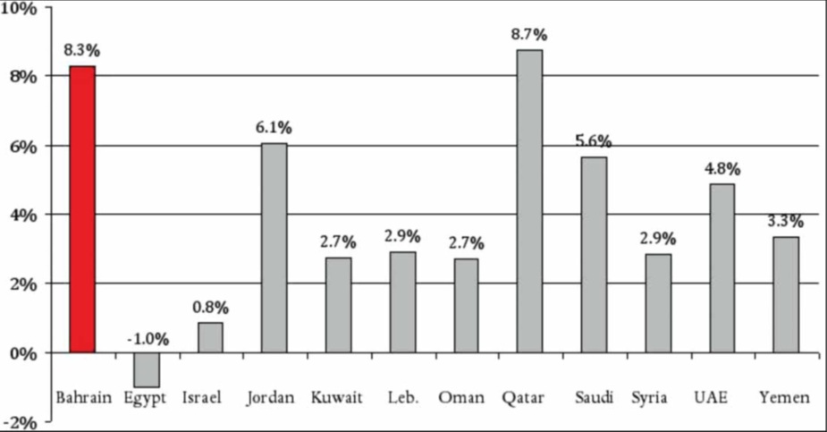 (75) تمثل تلك البيانات بطبيعة الحال جانبا واحدا من الإنفاق الكلي والانشغال بالأمن الوطني. أما ما لا يمكن معرفته من هذا هو الإنفاق على الشرطة والأمن والخدمات الداخلية الأخرى، التي لم تتوفر بياناتها بالمثل. من ناحية أخرى، تم تكليف قوة دفاع البحرين ليس فقط "للدفاع عن البحرين ضد العدوان الأجنبي" ولكن أيضا "للمساعدة في حماية السلطة الحاكمة الشرعية وسيادة الدستور والمساعدة... في الحفاظ على الأمن والنظام وسيادة القانون ". [لجنة تقصي الحقائق، تقرير لجنة البحرين المستقلة لتقصي الحقائق، 23 تشرين الثاني/نوفمبر (راجع 10 كانون الأول/ديسمبر) 2011، ص. 51.] وهكذا، فإن الزيادات العالية بشكل غير متناسب في البحرين على الإنفاق العسكري من 2001 إلى 2011 بالمقارنة مع بلدان أخرى في المنطقة توحي بأن قادتها كانوا يضعون رهاناتهم ضد نتيجة سلبية ممكنة من برنامج الملك حمد الإصلاحي.