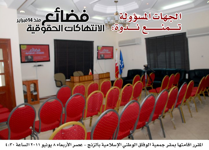 إلى ذلك قالت صحيفة "القبس" الكويتية إن الحكومة منعت ندوة لـ "الوفاق" في مقرها بشأن انتهاكات حقوق الانسان أثناء الاحتجاجات. وأضافت أن "سيد