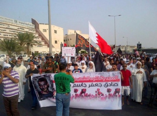 موكب التشييع انطلق من بلدة صغيرة يسكنها الشاب صادق سبت (22 عاما) مع عائلته. وردد المتظاهرون شعارات مناوئة لملك البحرين حمد بن عيسى آل خليفة الذي حملوه مسؤولية مقتل المتظاهرين وتوعدوا بمحاكمته.