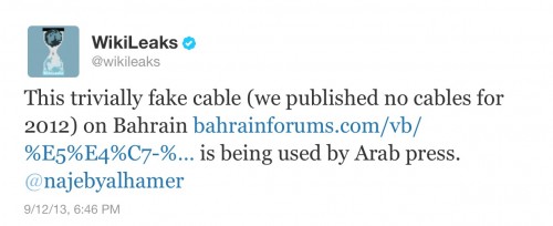 وأكدت ويكيليكس أنها لم تنشر أية تسريبات عن البحرين في عام 2012.