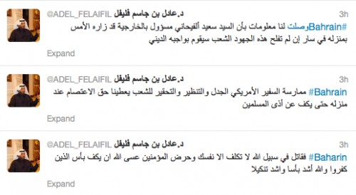 وقال العقيد السابق عادل فليفل، الذي سبق له أن أعلن عن حصوله على ميدالية تقدير من وكالة المخابرات المركزية الأميركية «سي آي إيه» لدوره في جهاز الأمن البحريني خلال فترة أمن الدولة، إن «ممارسة السفير الأمريكي (توماس كراجيسكس) الجدل والتنظير والتحقير للشعب يعطينا حق الاعتصام عند منزله حتى يكف عن أذى المسلمين».