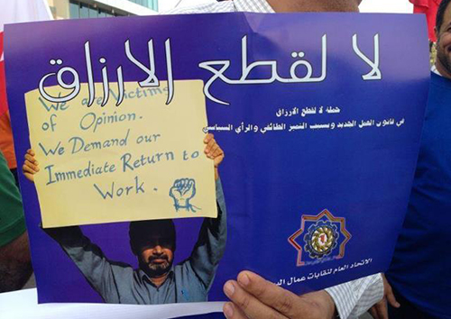 أما "الوسط" فأضاءت على الاعتصام الذي نفذه المفصولون من العمل أمس الإثنين للمطالبة بإعادتهم إلى أعمالهم، أمام مقر الاتحاد العام لنقابات عمال البحرين بالعدلية تزامنا مع زيارة وفد من منظمة "العمل الدولية".