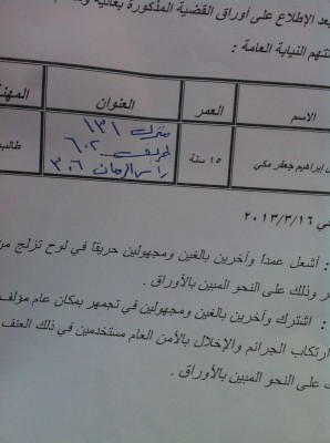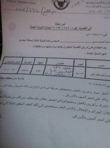 وقامت بتسليمهم إحضارية تطلب مثوله في مركز الحورة فوراً بتهمة «إشعال حريق في لوح تزلج والمشاركة مع آخرين في تجمهر بمكان عام للإخلال بالأمن العام بتاريخ 16 مارس/ آذار 2013».