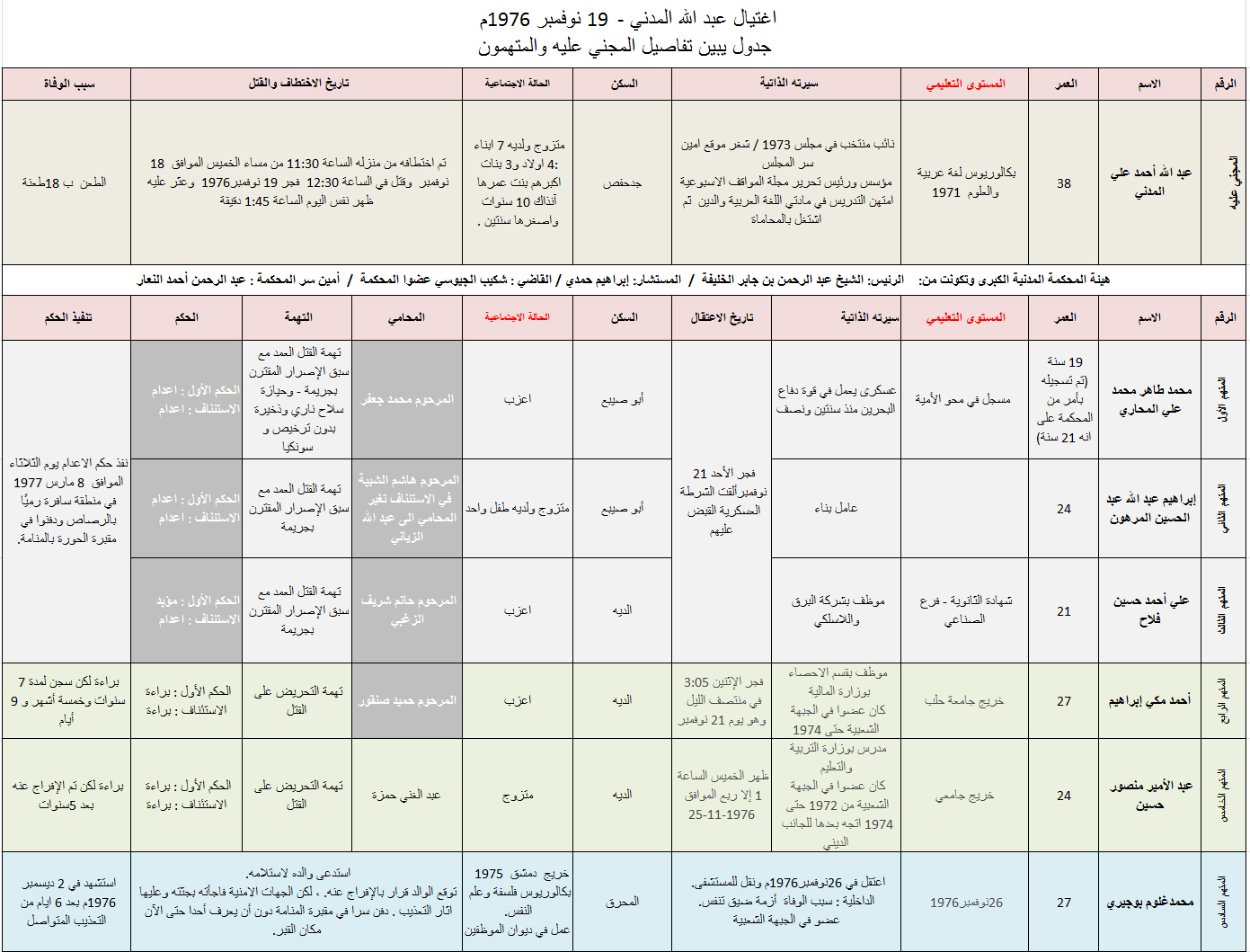ليس دفاعاً عن أحد، لكن هؤلاء هم الوحيدون الذين لم يُتح لصوتهم أن يُسمع في ظل الزلزال الذي أحدثه اغتيال الشهيد المدني. ذهبوا سريعاً، وأهلهم حتى الآن، وبعد مرور أكثر من 37 عاماًَ على الحادث المحفور في الذاكرة البحرينية، ما يزالون يحملون الغصة في قلوبهم، والكلام المقموع في داخلهم. كذلك من تمت تبرئتهم وقضوا في السجن شهوراً بعد إصدار حكم البراءة. لا يزال هذا الملف الحساس والمحاط بالكثير من الأسلاك الشائكة محصوراً في رواية السلطة وحدها فقط.
