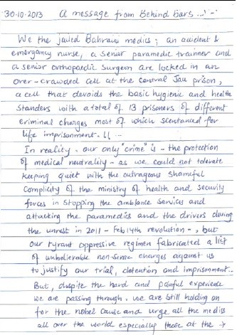 مرآة البحرين (خاص): نشرت منظمة "أطباء من أجل حقوق الإنسان" رسالة مسربة من الكادر الطبي المعتقل في سجون النظام البحريني، أعلنوا فيها عزمهم تشكيل هيئة مستقلة للكادر الطبي العامل في حقوق الإنسان.