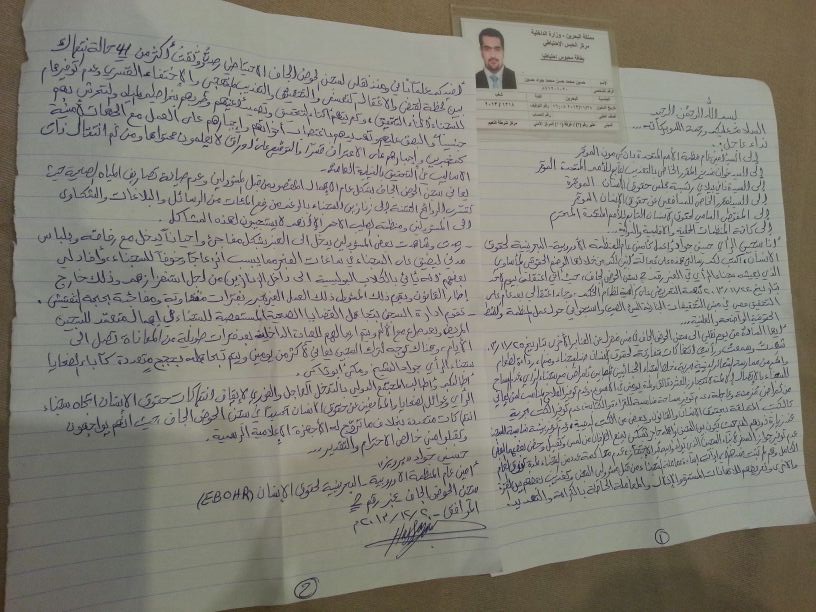 وفي رسالة مسربة من السجن كشفتها زوجته أسماء درويش أمس على هامش المؤتمر الإعلامي التضامني مع "برويز"، وجّه الأخير نداء عاجل إلى كل من الأمين العام للأمم المتحدة بان كي مون والمقرر الخاص بالتعذيب التابع للأمم المتحدة خوان منديز، المفوضة السامية لحقوق الإنسان نافي بيلاي والمنظمات المحلية والدولية، للتحرك لإنهاء "الوضع الحقوقي المأساوي الذي يعيشه سجناء الرأي في "عنبر رقم 2" في "الحوض الجاف".