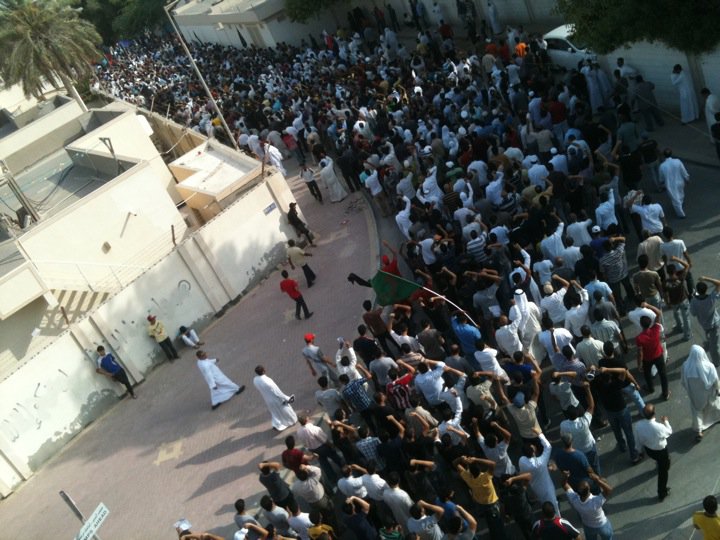 كيلومترين من المكان الذي تقام فيه مراسيم التشييع. ومن بين الشعارات "أعذاركم قديمة قد بانت الجريمة" و"حوارهم كذب كذب" و"لن نركع إلا لله". وانطلقت مسيرة التشييع من جوار أحد المساجد في منطقة السهلة متجهة إلى المقبرة الخاصة بالمنطقة، حيث من المقرر مواراته إلى جوار قبر الشهيد علي صقر الذي قضى تحت التعذيب.