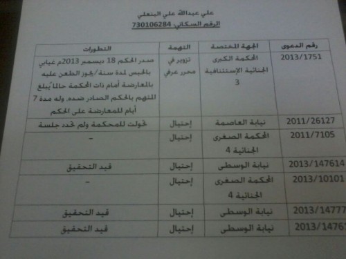 مرآة البحرين (خاص): علمت "مرآة البحرين"، أن المحكمة الكبرى الجنائية الاستئنافية أصدرت في 18 ديسمبر/ كانون الأول 2013 حكماً "غيابياً قابلا للطعن" بالحبس لمدة عام على علي البنعلي، رئيس نقابة ألباء والاتحاد الحر للنقابات الموالي للسلطة، بتهمة التزوير في محرر عرفي، وذلك وفق الدعوى رقم 1751/ 2013.