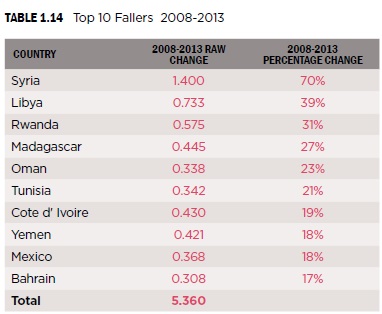 وبعد أن بلغ أفضل مستوياته في العام 2010 بمعدل 1.78 (1 الأفضل، 5 الأسوأ)، مؤشر الساقطين ذريعا إثر انطلاق احتجاجات 14 فبراير/شباط، ليصل إلى 2.192، وكانت البحرين مصنّفة على أنها الدولة 47 من حيث انتشار السلام على مستوى العالم، لكنّ هذه المرتبة تدهورت بحدة لتصل إلى ذيل القائمة (99 من 162) في العام 2011، و95 حسب آخر مؤشر (2013).