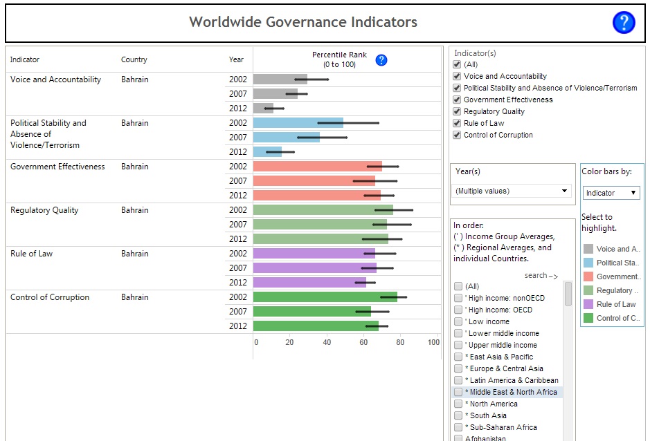 وسجّلت البحرين أيضا تراجعا ملحوظا في مؤشرات "الحكم الصالح" التي تصدر سنوياً عن البنك الدولي، حسب تقريره الأخير الذي صدر في سبتمبر/أيلول 2013.
