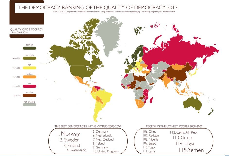 وقد عكفت المنظمة، التي تتخذ من "فيينا" مقرا لها، الديموقراطية. وفي المؤشر الأخير شمل التقييم ما مجموعه 115 بلدا باستخدام نهج علمي متعدد الأبعاد يدمج الجوانب السياسية وغير السياسية للمجتمع، مثل الحرية، المساواة بين الجنسين، الاقتصاد، المعرفة، الصحة، والبيئة.