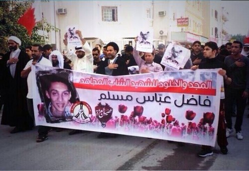 وردد المشاركون هتافات غاضبة طالبت بالقصاص من قتلة الشهيد فاضل عباس مسلم (19 سنة) كما حملت الملك حمد بن عيسى آل خليفة مسئولية قتله.