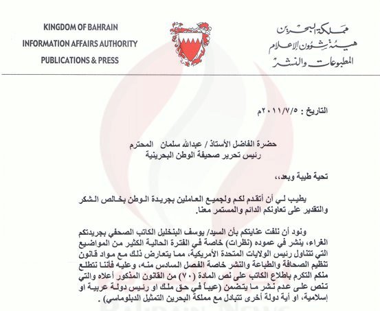 وهو النفي الذي تقابله الهيئه بالصمت حتى الآن. على الرغم من تأكيد الصحفي يوسف البنخليل على تلقيه اتصالا ممن أسماهم "مسئولين" في الهيئة أطلعوه على ما قال "انزعاج واستياء السفارة الأميركية بالمنامة من سلسلة كتاباتي حول السياسة الخارجية للرئيس أوباما تجاه البحرين".