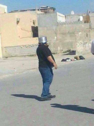 مرآة البحرين: لم تسنح الفرصة لهذا المتظاهر اقتناء خوذة غالية الثمن كي يحمي نفسه من الرصاص، خاصة الشوزن المحرّم دوليّاً، فصنع خوذته.